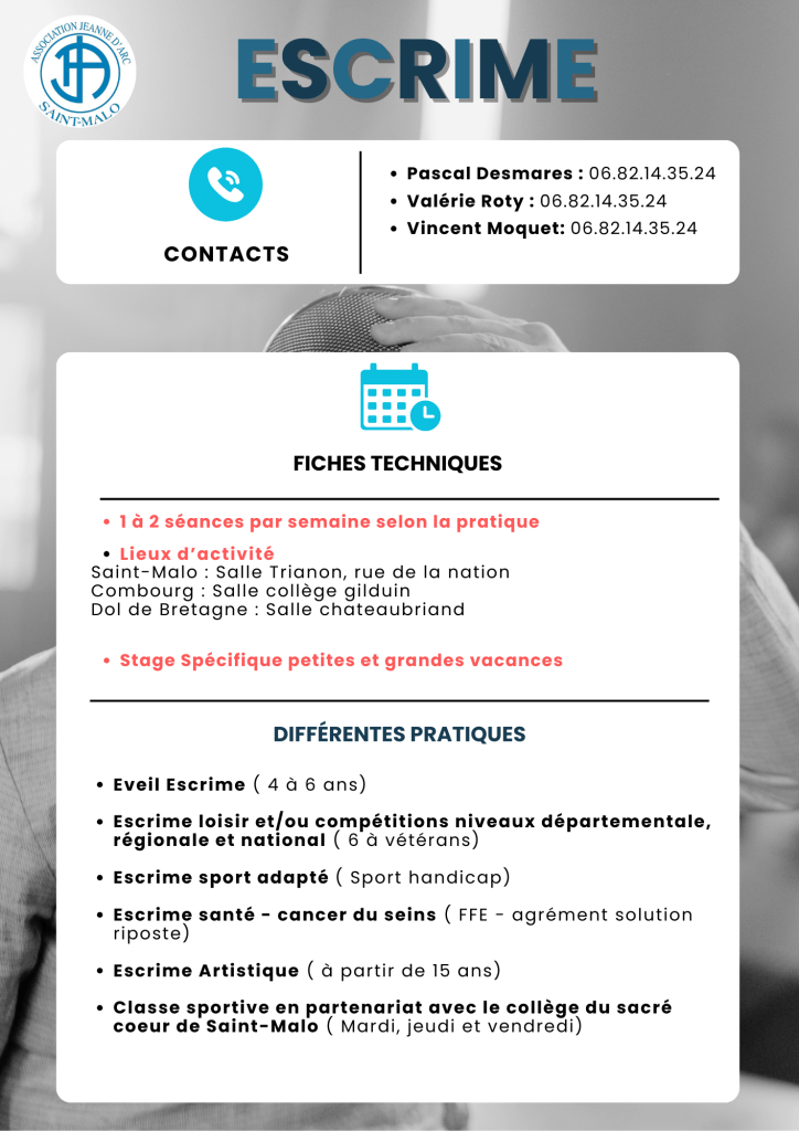 La Section ESCRIME de l’Association JEANNE D’ARC SAINT-MALO accueille 200 escrimeurs par saison, débutants ou confirmés, enfants dès 5 ans, jeunes et adultes pour la pratique de l’épée, en loisir, en compétition, en Escrime Artistique, Escrime Santé et Sport Adapté.